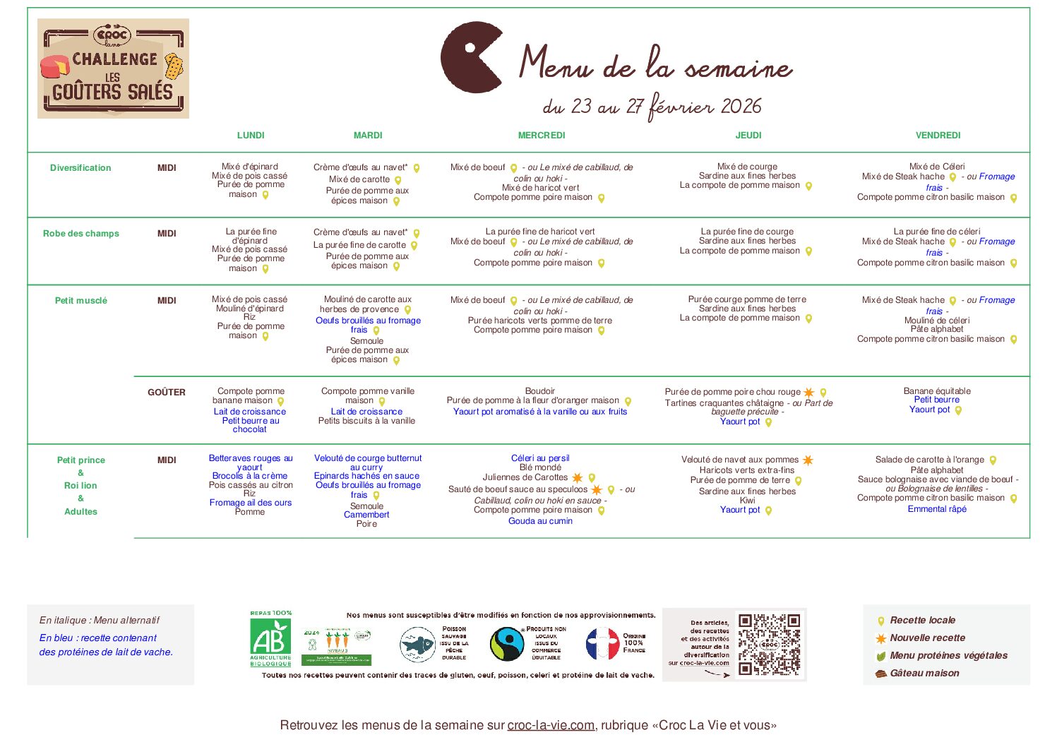 Pour télécharger ce menu sous forme de pdf, et en savoir plus sur les aliments, les provenances et les éventuels allergènes, suivez ce lien chez notre partenaire Croc la vie :